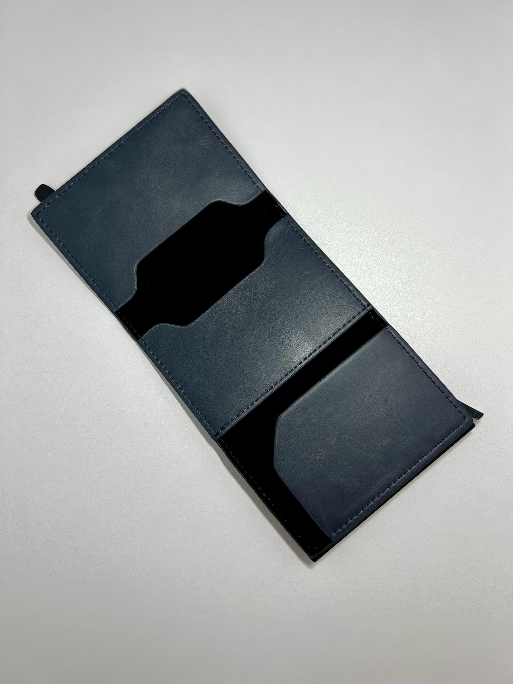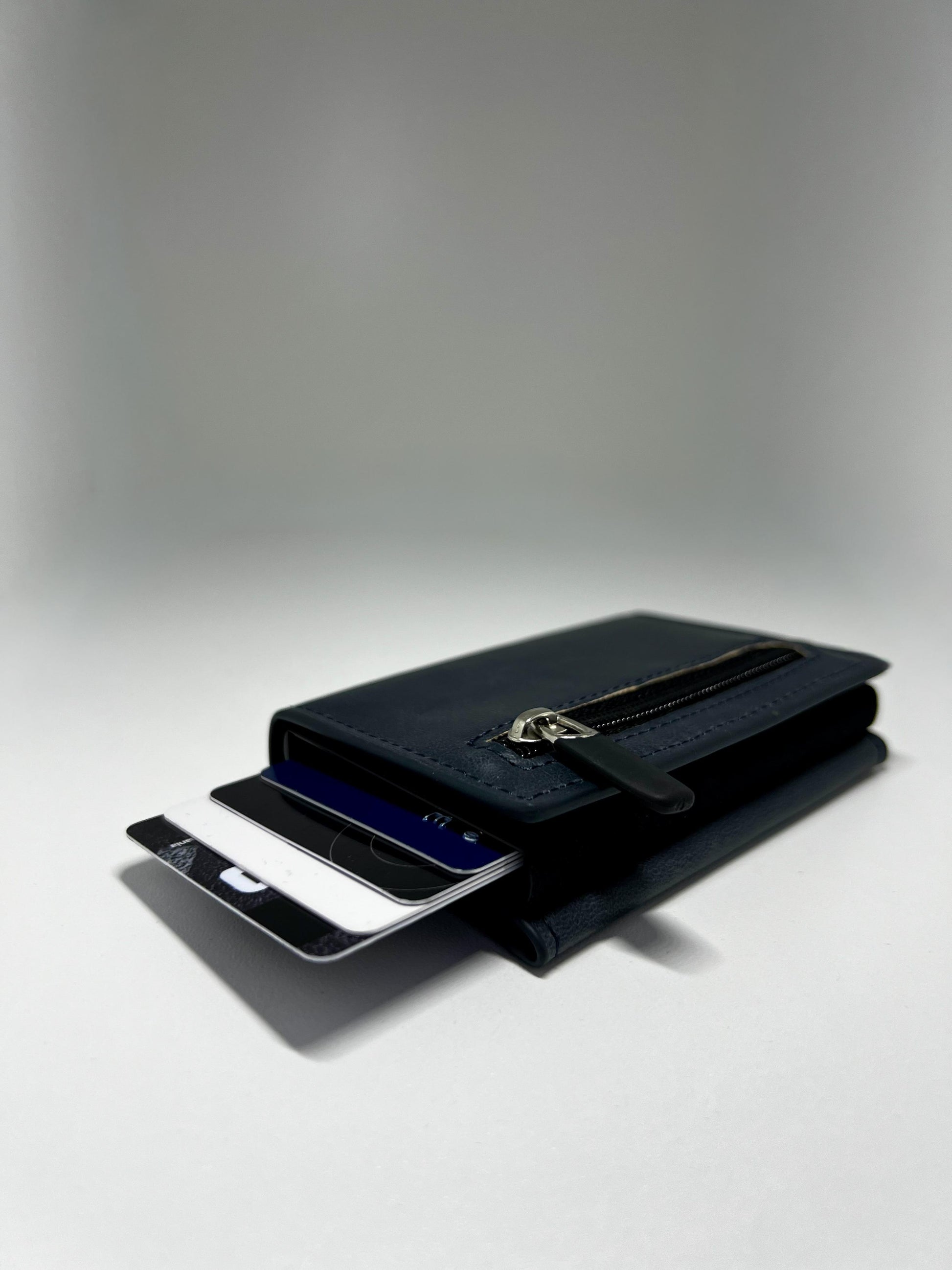 Cu o carcasă metalică îmbrăcată în piele ecologică fină, TrueFold îmbină durabilitatea cu rafinamentul. Cardurile din compartimentul principal se accesează instant printr-un buton lateral elegant, iar cele două sloturi secundare sunt perfecte pentru cash sau carduri suplimentare. Sistemul anti-RFID îți protejează datele, iar închiderea magnetică puternică îl menține mereu stabil și impecabil închis.